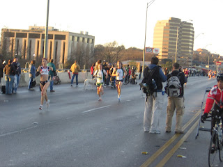 I had a great morning biking all around the Austin Marathon (15-20 miles) watching Neely, Brian and John Welsh run. Neely ran an inspired race, starting off fairly conservatively and then ratcheting it down and picking people off in the second half of the race to finish 6th in 2:24, including one very quick pit stop.